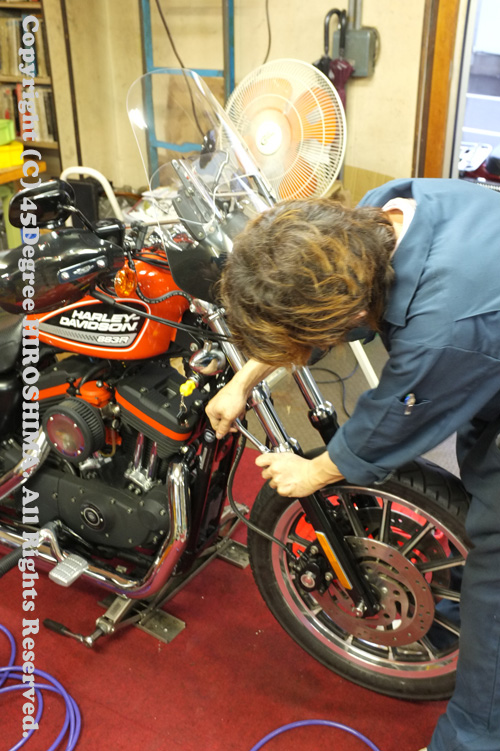 2008年FLHXのフロントローダウンと、ゴールドバルブのインストールを行いました。