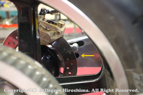 リアブレーキのサポートと、スイングアームが繋がっている部分の位置が全然違っていました。本来は写真の位置になければいけませんが、黄色い矢印の丸い穴に取り付けられていた。丸い穴に取り付けられてしまうと、ベルトの張り調整をするための機構が正常に働きません。そのため、ベルトの張りが有り得ないほどの異常MAXテンションになっていた。
