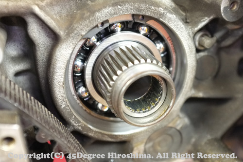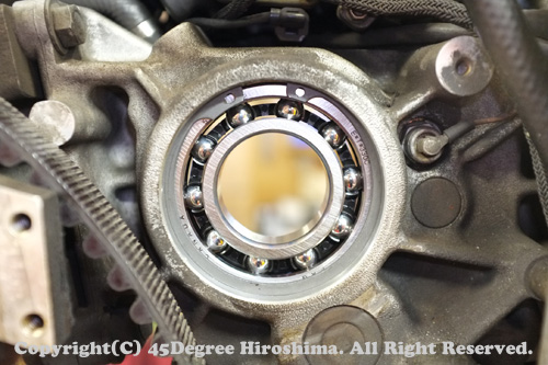 そのベルトの張りが原因で、フロントプーリーにも異常なテンションがかかってしまい、そのままメインドライブギアにテンションが伝わり、結果として、「力の逃げ」を求めてベアリングが外に出てきていました。オイルが漏れていたのは、本来付いているハズのオイルシールが飛んで、なくなっていた為です。