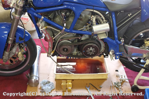 元々は電気系のトラブルで、近くの小谷SAからご連絡を頂いたのがきっかけ。こちらの電気系トラブル、当初レギュレーターか、ステーターコイルのトラブルかと思っていましたが実は全然ちがう所が原因で、とても判りにくい症状で念入りに探りやっとの思いで見つけ出した!しかし・・・・、その探っている間にMAXテンションの1ミリも遊びがなく動かないベルトを見つけ、テンションを解こうにも動かず、そして・・・・ミッションオイルがダダ漏れになっているのを見つけ、同時にメインドライブギア上の奥に収められているニードルベアリングが顔を出しているのが見え、こりゃ只事ではない・・・と判断し、このまま自走して帰るのを断念してもらいました。そして、そのまま修理と相成りました。