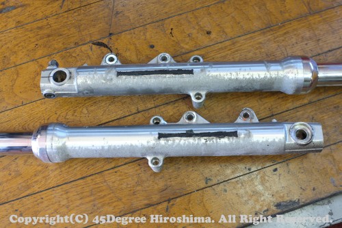 フロントフォークは表面のクリアーが剥がれ、地金であるフォークスライダーがかわいそうな状態でしたが、ツルンとさせた上でペイントで黒くお化粧を施しました。また、このフロントフォークにはレーステックゴールドバルブと、同社スプリングが組み込まれていますが、オーバーホールで開けてみるとスプリングの塑性変形が確認されましたので、ゴールドバルブ側も含めスプリングを新品交換致しました(・∀・)