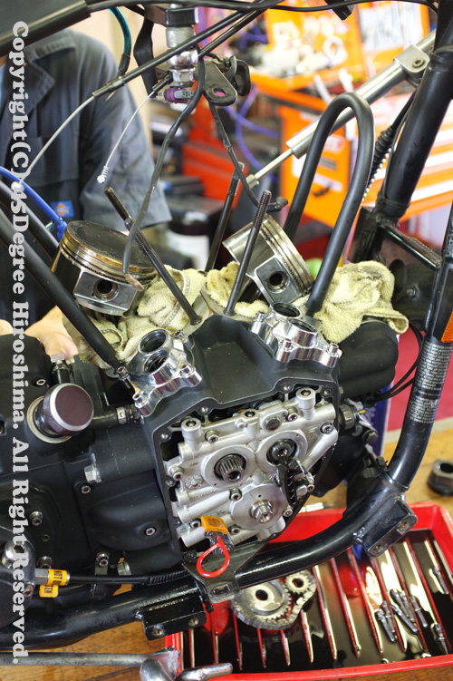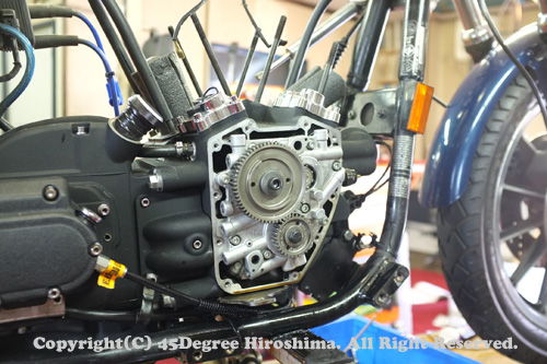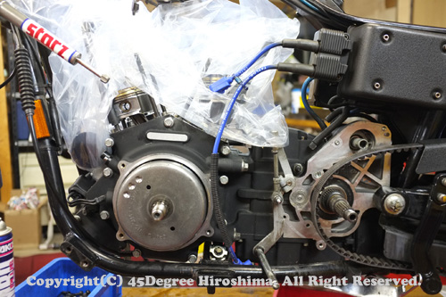 詳しい人はお気づきですかね〜?このクランクケース、99年式のケースではないんですね。実はエンジン各部品も99年式のまんまより、かなり新しい部品で構成し直してあります。ピストンも、99年式のピストンはマイクロメーターで計測するポイントで判別できますね。ってな感じで、かなり改造しまくっている、とは一味違う渋い変更です(・∀・)