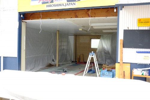 メカニックが活動する整備場内の空間拡張が行われます。同時にショップの正面扉にも手を加え、今の時期に多い羽虫が侵入してこないよう、対策が行われます。