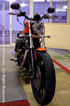 少し前ですが、レーステックのゴールドバルブ化と、ヘッドライトのローマウント加工で福岡からご来店のF様。2010年式のXL883Rです。