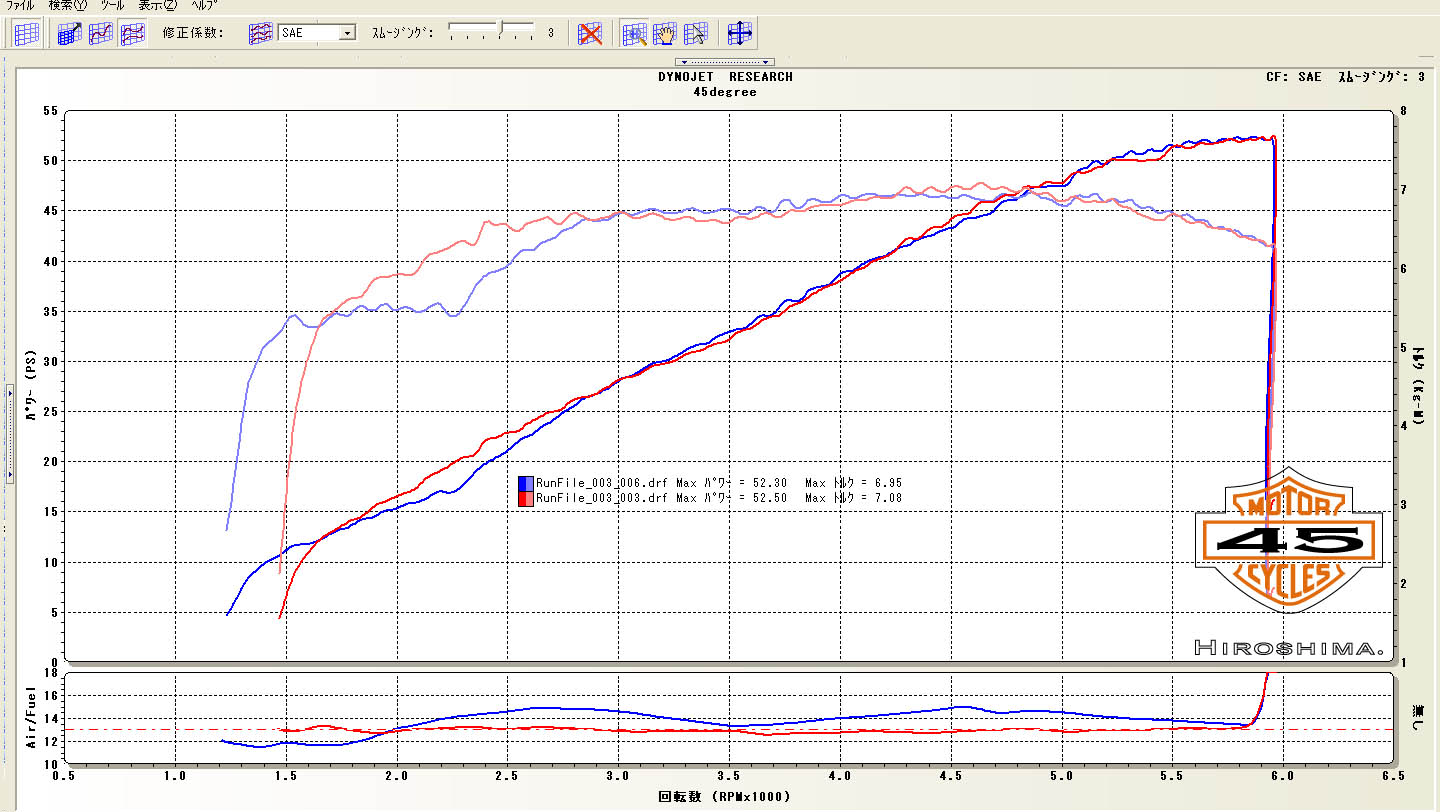 実は最高値はほとんど誤差の範囲で変わってはいません。セッティング前でも空燃比を見ると明らかに空気が多く(ガソリンの割合が少ない=薄い)ガクーンとパワーダウンしても不思議ではないのに、グラフは綺麗な弧を描いてます。