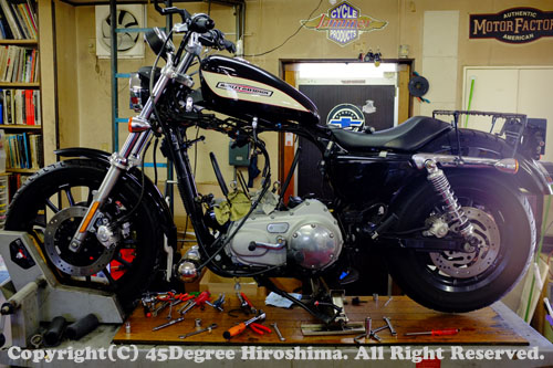 今回のリフレッシュ作業は最近乗る機会が減っているようでして、それに加えて下のトルクがなくなった感じでツーリングに行くのが怖いくらいになっているとのこと。2005年購入から自前でオイル交換、部品交換されているそうですが、特に整備に出したこともない、との事で、気持ちよく走れるXL1200Rのトータル的な整備でとの事でご依頼頂きました。