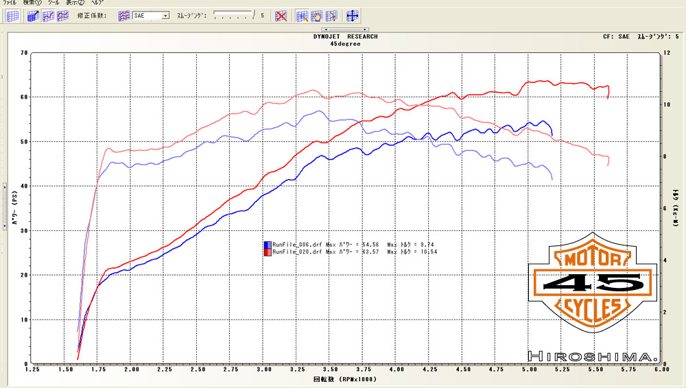 エンジンをやり直す前後で、9馬力、トルクは0.8km-Mもの差が出ました。エンジン組み直すとキャブレターセッティングも変更が必要でしたので、合わせて行いました。