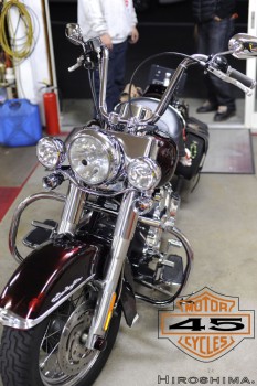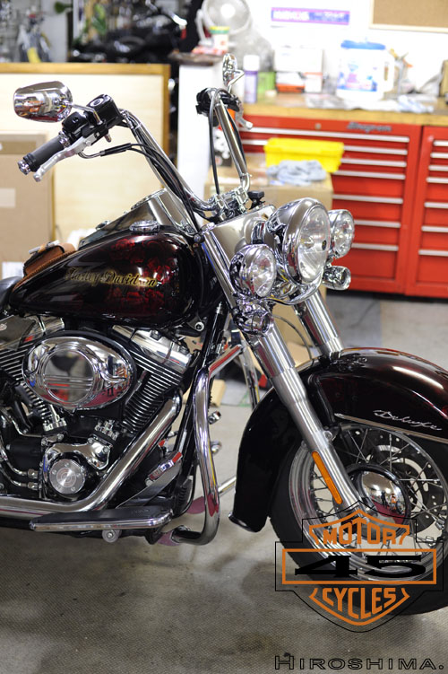 以前取り付けさせて頂いたハンドルからの、ハンドル寸法は以前とほぼ近く、見た目は、センターワイドからの立ち上がりの線は細く、綺麗なラインを描くハンドルを取り付けました。高さは30cm(約)ほどのハンドルです。クラッチケーブル交換が必要でハンドルのみ交換と比べると数倍以上の手間ですが、その甲斐あったようです(^v^)