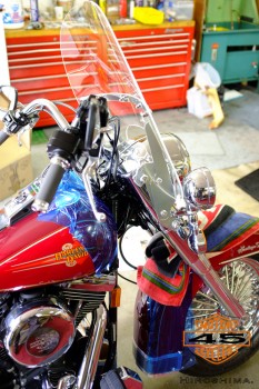 一般的にFLST系へナセルを取り付け、そこへ標準のウインドスクリーンを付けようとすると、切らなければ取り付けできなくなり、別途ハードウェアが必要となりますが、その手間はゼロです。