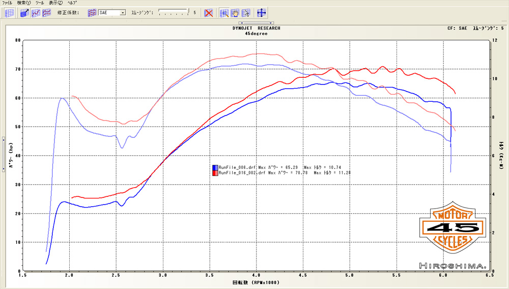 こちらが、カム交換後のビフォー・アフター。最高値70馬力・トルク11.28kg-Mをマーク。サンダーヘッダーEXをチューンしてトルク落ち込みを改善し、馬力も上がりましたが、キャブレターのセッティングは固定したままでも、これだけの差はが出るとは、デカイ!実走でもトルク改善は体感出来ますよ。キャブ車には特に効果てきめんです♪♪