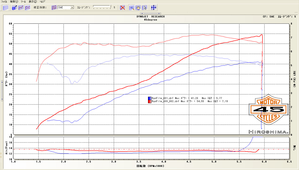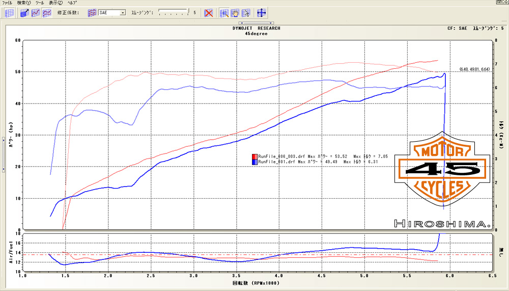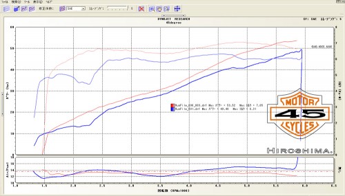 こちらはフル純正データーとの比較をあえてしていますが、こちらも、トルク落ち込みが大幅に改善されて、アクセルを開けても、スッと前に進む様子が、グラフからも見て取れます!ストックマフラーではトルク落ち込みが見られますが、ガソリン不足で起こっているんじゃないのも空燃比の生データー取ってみて実証済み。しかし、ストックからの変わりっぷりが、物凄いですね。13hp・1.4kg-Mも出力向上!もう、シグナルスタートで50ccのスクーターに負けそうな事はないでしょう。