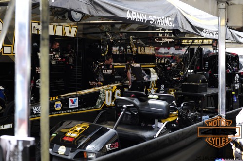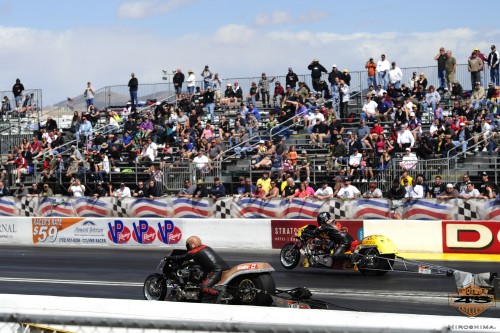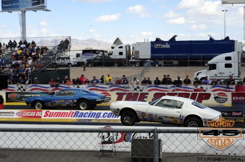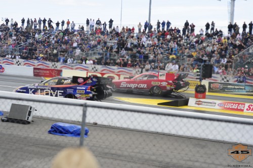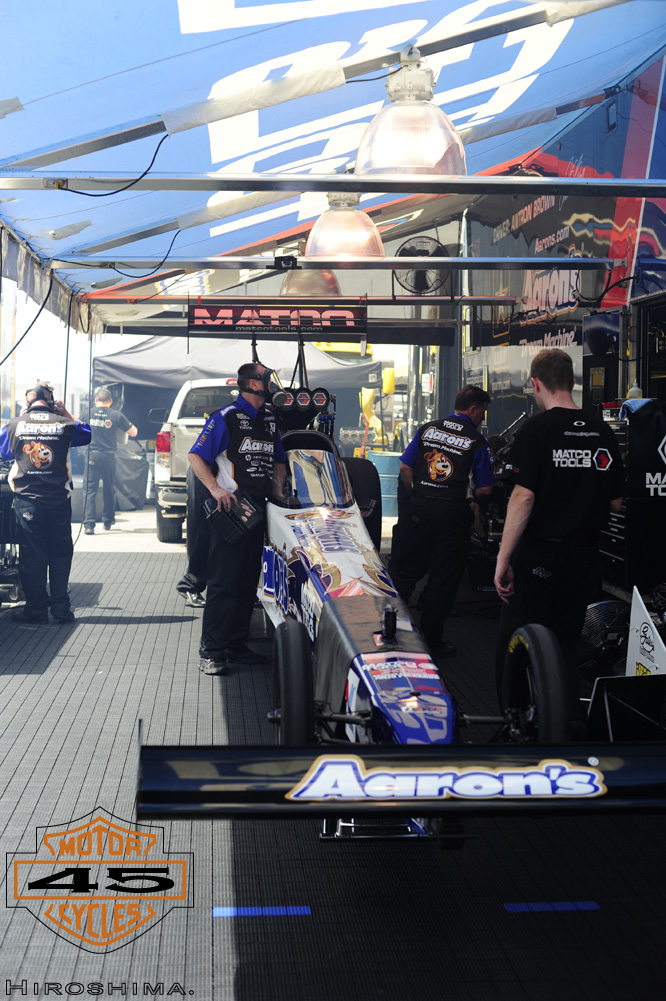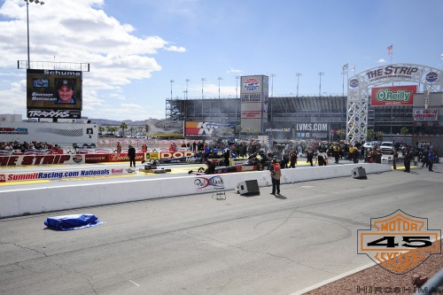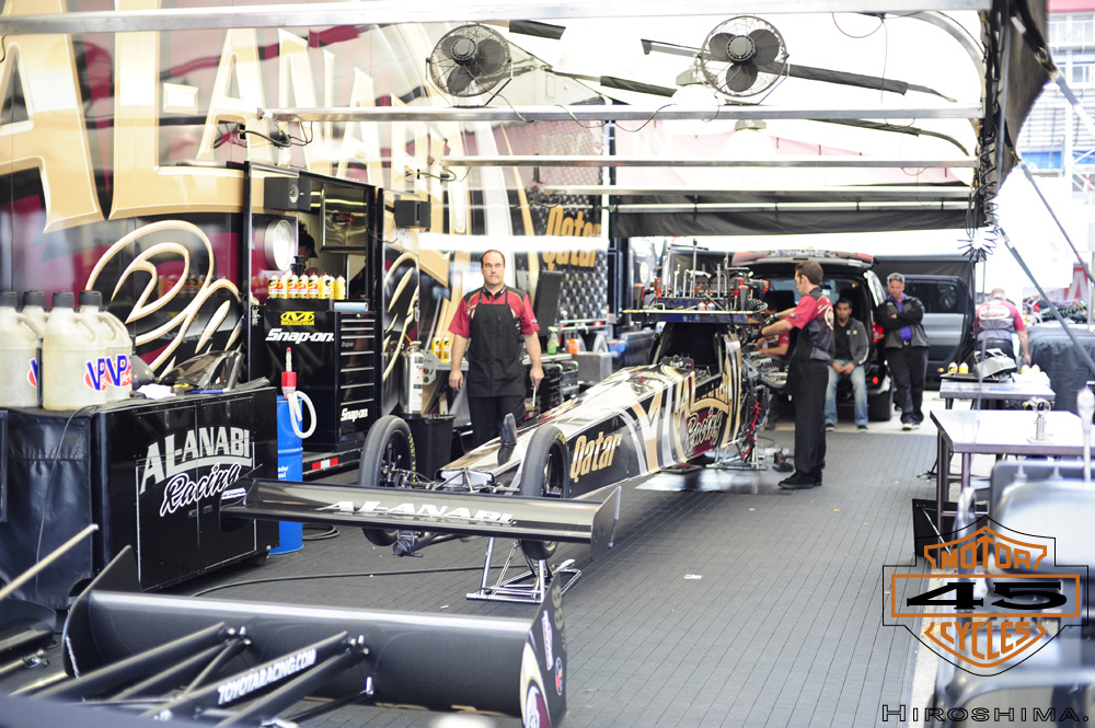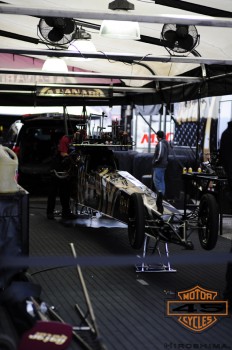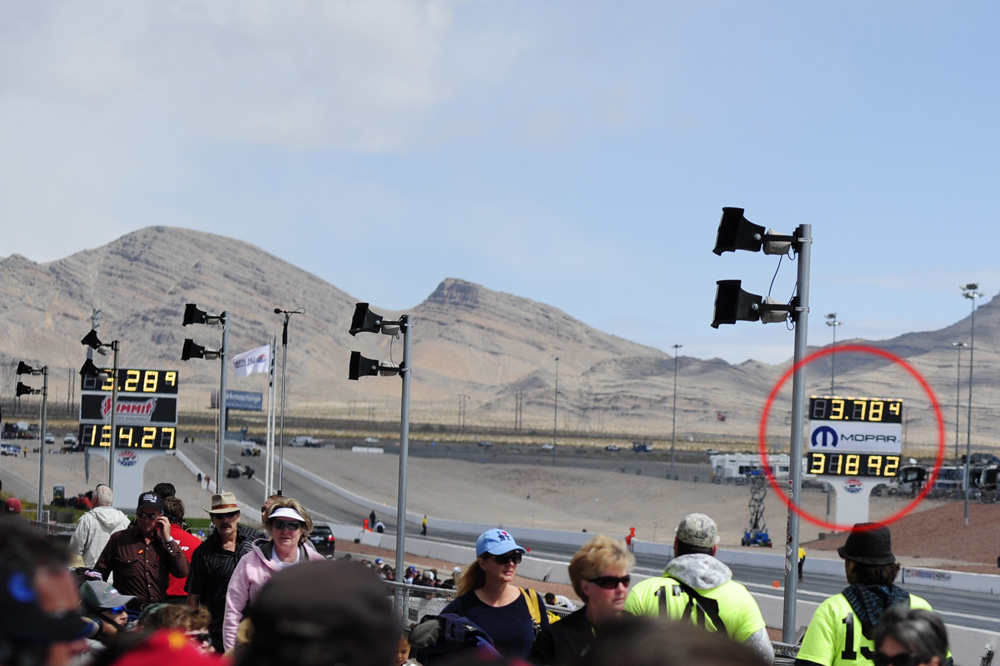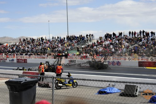 不意にスタートしたと同時に、体感した事のない轟音と衝撃波に、思わず「危ない!」と感じ、身を伏せ、そして走り去るトップフューエルマシーンを、視点が定まらないほどビリッビリ伝わってくる衝撃波により震えまくる眼球で、走り去るマシーンを豆粒の様に小さくなるまでに、安定して捉えるに精一杯。まず、日本に居たら感じることはない感覚だと思います。これに比べたら残念ながらF1の排気音は蚊の羽音程度でとても穏やか。世界まる見えTVなどで、トップフューエルの走る映像はかなり沢山見ていましたし、各種レースも日本で沢山見てきましたが、観戦しているだけで、ここまで穏やかではないレースだとは、想定外です!!アメリカ人達が、NHRAを見て、興奮するのが判りました!こりゃ、楽しい!!