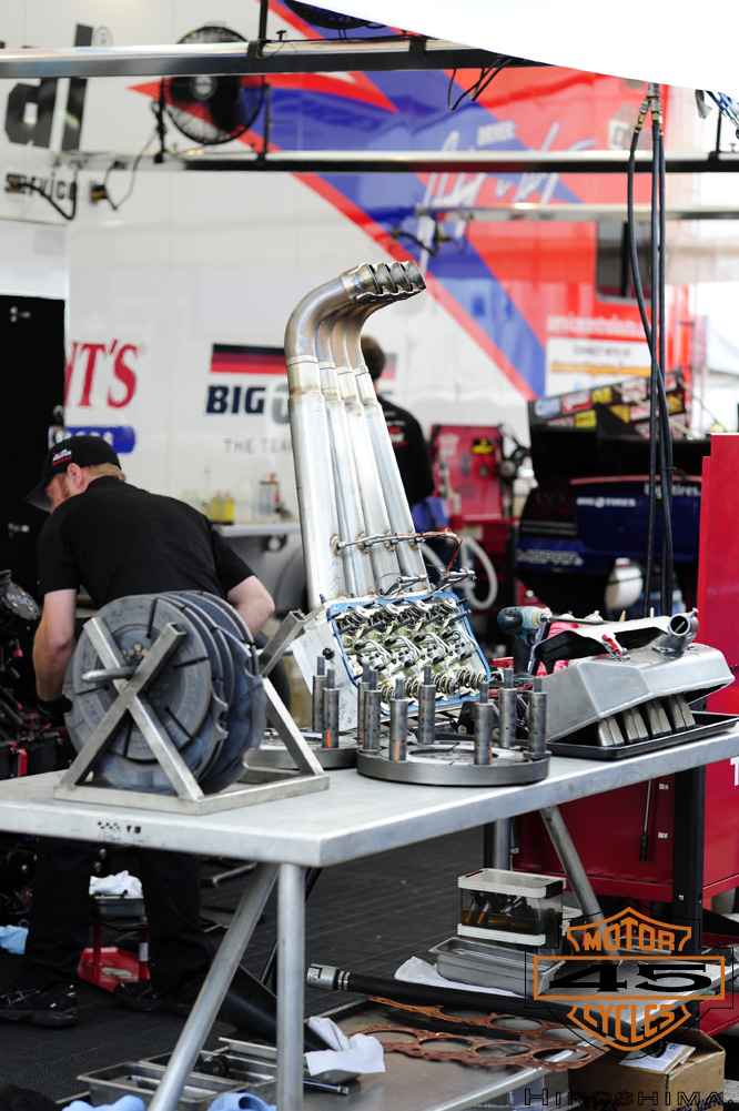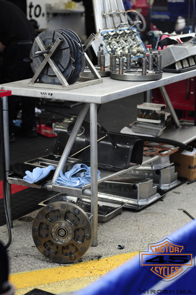 物凄い勢いで分解されています。一度走っただけで、エンジン分解、組み立て。1レース毎にオーバーホールが必要で、10秒以上の全開運転はできないという事。決勝まで残ると最低3回はオーバーホールすることになります。おまけに、どうみても先ほど時速500キロ以上で走ってきたばかりなので、アツアツの出来立て。