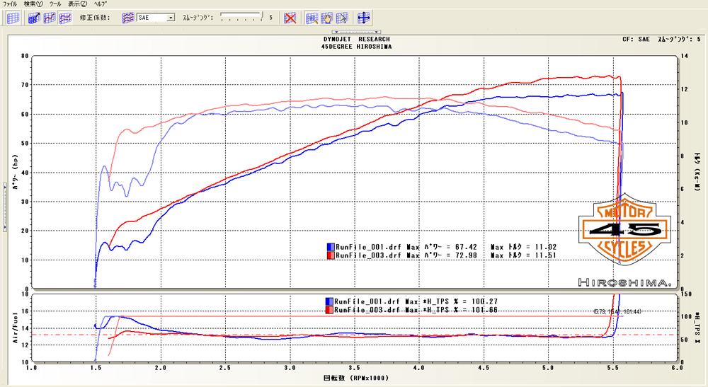 青い方がブラックボックスチューニング前のロールオンテストで、赤い方がブラックボックスチューニング後のロールオンテストです。