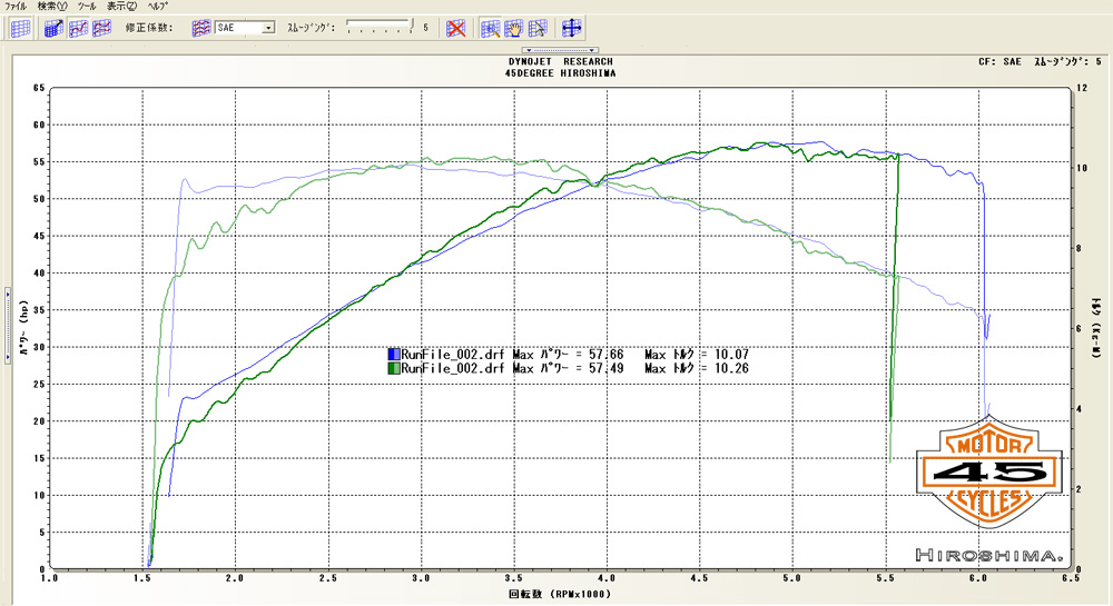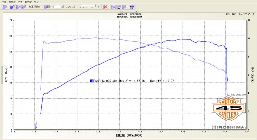 これは、青いグラフがこのFLHXのご入庫時のロールオンテストで、緑色のグラフは、・・・・というと・・・・たぶんショッキングだとは思いますが、ど純正のハーレーFLHXのデーターです。それでもアクセル開け始めの応答性などは青いグラフに軍配が上がります。純正のデーターと、ほとんど変わりがないのは、各パーツのチョイスですね。主にマフラーで、出口をふさいでいるメッキのプレートが原因でしょう。