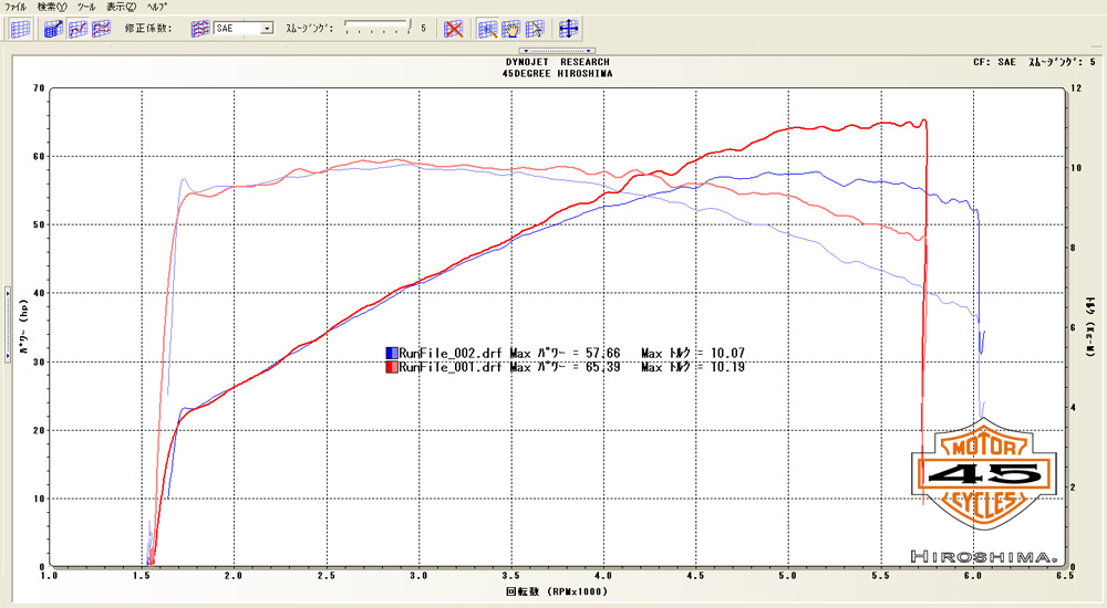 馬力がグイッと伸びてますが、それから想像されるようなカムは使っておりません。マフラーによって阻まれているのがとても残念。カムを交換した割に大幅な変化がないグラフになってしまいましたが、この場合ちょっとカムの選定を間違うと逆にトルクダウンにもなるので、まあ良しでしょう!