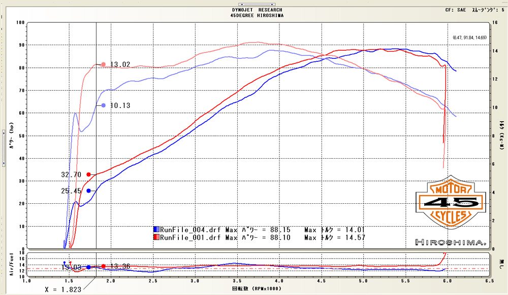 そして、こちらはチューニング後の結果とオーバーラップさせたグラフとなります。最高馬力は変化ありませんが、ノーマル110キュービックエンジンCVOで88馬力とは最高に馬力が出るマフラーは伊達ではないですね! トルクの落ち込みについては、比較をしてみると、ああ、やっぱり有ったんだね!って感じですねえ。トルクアップさせる為に工夫を施しています。2000回転以下なんてトルク値3キロ近く差が出てるので大幅に走りやすくなっているハズ!?!?ご納車前にオーナー様に試運転お願いして感想を頂きましたが、親指立てて、良かったよ!と感想頂きました! 高速道路走るのが楽しみや〜って事でした。また、なにかありましたら、お願いしますね。