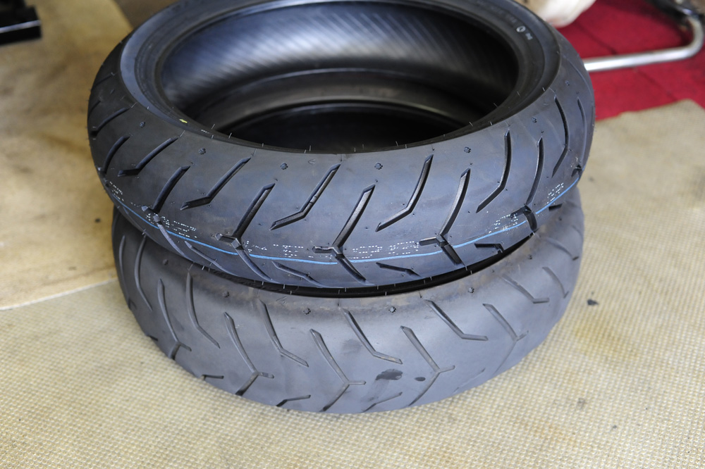 元々はメッツラーのタイヤでオーダー頂いておりましたが、こちらが国内在庫無しの長期入荷未定となり、純正タイヤのダンロップで探してみると大阪の倉庫に前後1セットのみ。ワンテンポ遅ければ、タイヤ交換すら出来ない危ない所でした。ギリギリセーフ!