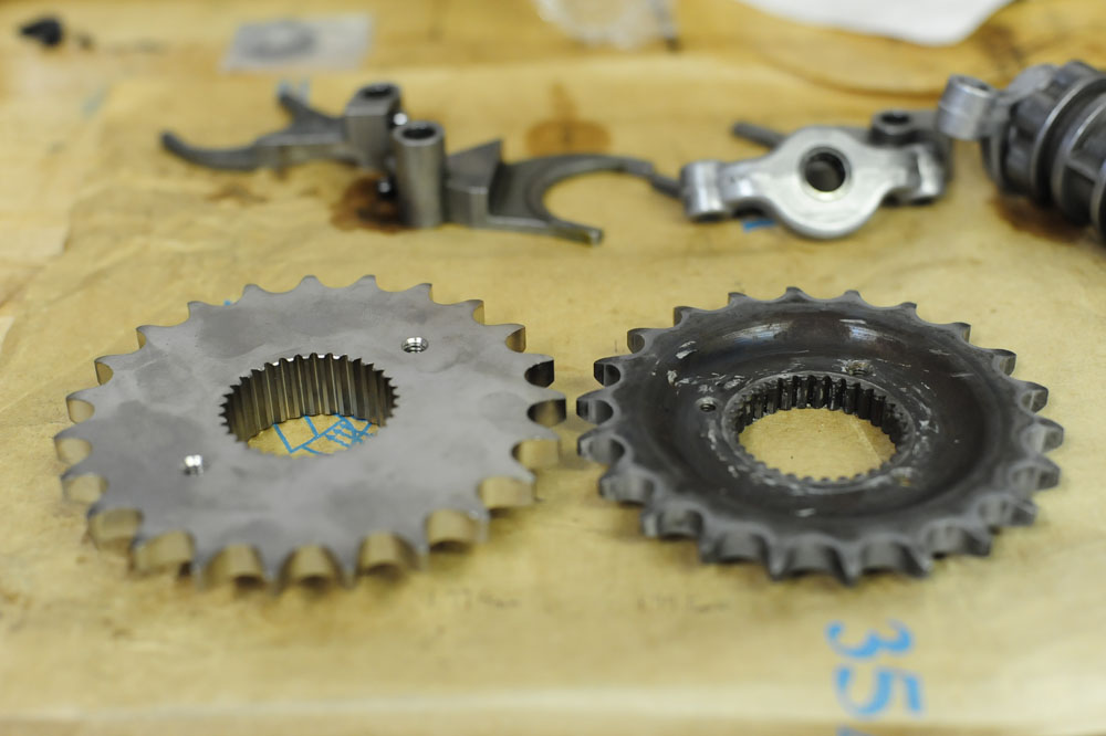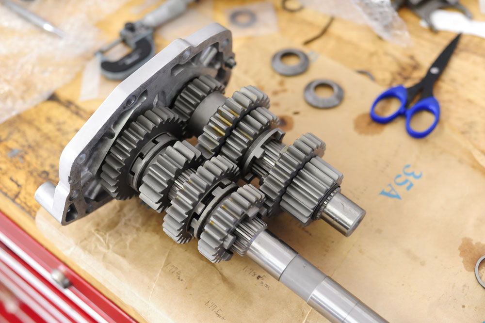 この度FXRを、ここまでのリフレッシュに導いた立役者(??)いや 「主犯」 が、このトランスミッション。2・3・4速ギアで走行時の、ギアの唸り音が酷く大きかったのです。2<3<4!という感じで音の大きさは変わっていました。どれどれ・・・と開けた結果、それぞれ小さい摩耗、ガタが、トランスミッションというギアの集合体になったとき、大きなガタとなっていたようです。