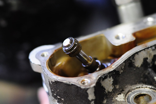 これ、だいぶ前にエンジンのガスケット交換とシートカットを行なった際に交換したものですが、バルブガイド側へ挿入される部分のシールがだいぶ緩くなっていました。それが原因で抜けてしまったのでしょう。